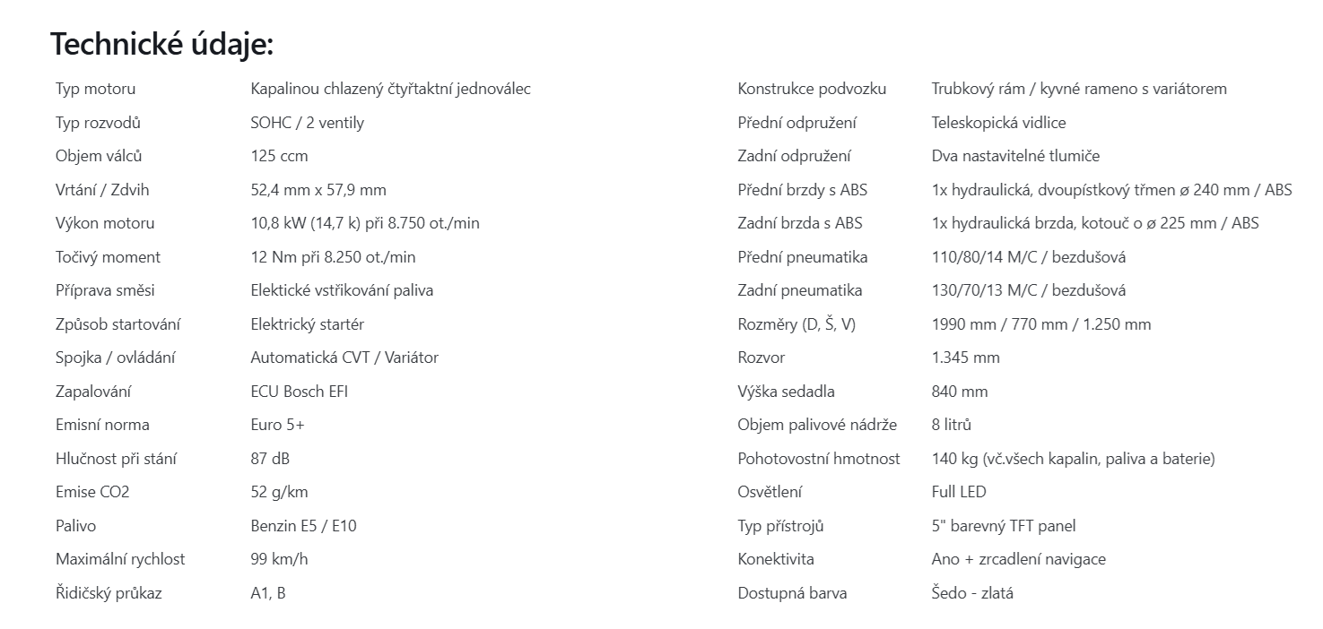 Hledáte stroj, který zvládne městskou džungli i rozbité okresky s naprostým přehledem? Naše novinka ATR 125 je crossover, který boří mýty o běžných skútrech. Navíc už v základu nabízí výbavu, za kterou se jinde připlácí desítky tisíc, a jeho dravý design vás dostane na první pohled. Srdcem ATR 125 je moderní, kapalinou chlazený motor s téměř 15 koňmi. Pohonná jednotka se skládá z klasického spalovacího motoru a elektromotoru (startér - generátor) který pomáhá dosáhnout opravdu parádní zrychlení. Bezpečnost a komfort jsou zde na prvním místě. ATR 125 je standardně vybaven dvoukanálovým ABS, vypínatelnou kontrolou trakce (TCS) a prémiovým brzdovým systémem. O vaše pohodlí se stará bezklíčové zapalování (Keyless), nastavitelný čelní štít a přehledný barevný TFT panel, který nabízí plnou konektivitu, zrcadlení telefonu a navigaci. Přidejte hliníkový horní kufr, USB zásuvky, monitorování tlaku v pneu, LED osvětlení, modře podsvícené ovladače v základní výbavě a máte tu opravdu královsky vybavený stroj.