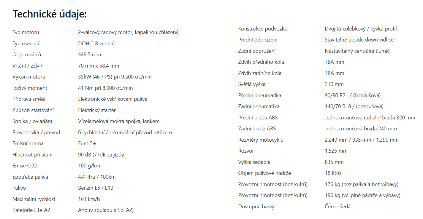 Dát naším zákazníkům - motorkářům to nejlepší - to je jasná filozofie značky QJMOTOR. Nový adventure SRT 450 RX je motocykl, který zasahuje do velmi nabité kategorie teréních čtyřistapadesátek. Jedná se o motocykl, který se poučil z chyb konkurence a přišel sice o něco později, ale o to více dotažený k dokonalosti. Motor má objem stejně jako rally speciály na Dakaru o objemu 450cc, ale jedná se o řadový dvouválec, oproti jednoválcovým speciálům. Důvod je jednoduchý naše SRT450 RX není dobrá jen v terénu, ale musí obstát i při svižných přesunech po běžných silnicích. Jeho robustní, ale účelná konstrukce je plně oddána dosažení co nejnižší hmotnosti, která však nejde na úkor kvality materiálů. Tyto stroje musí obstát i při drsném zacházení a čím lehčí motocykl je, tím je to na úkor kvality materiálu. Přidejte velkou nádrž, nízkou spotřebu, vysoké zdvihy podvozku a světlou výšku, full LED osvětlení, bohatou výbavu a hmotnost pod 200 kg i se třemi kufry a máte tu nového krále této kategorie!